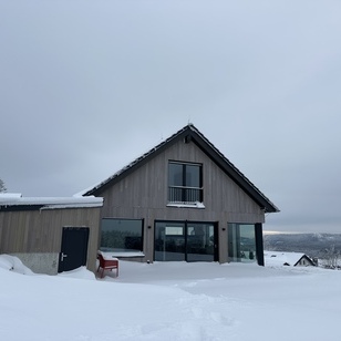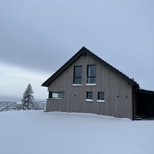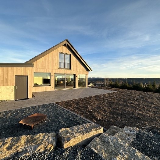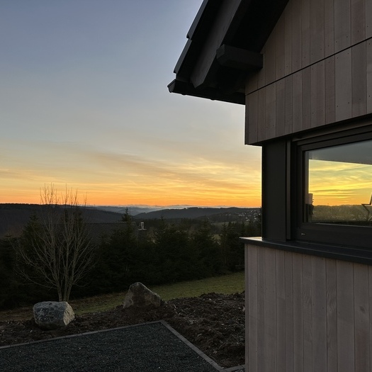 The dreamlike location with views over the heights of the Sauerland and far into the Siegerland defined the floor plan of the chalet as if by itself. In addition to the striking façade made of pre-weathered silver fir, a great deal of glass was used.