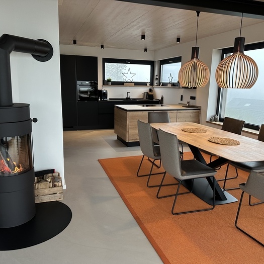 «In our search for a simple, modern yet classic wood stove, we came across the VIVA 120 L at Ofen-Galerie Stefan Grams in Düsseldorf and decided in favour of it after a very short time,» explains Timo Tiefenthal, «We chose the orientation of the stove so that you can enjoy the fire from every corner of the open-plan cooking, dining and living area.»