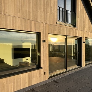 «The fantastic location of the property almost dictated the floor plan,» explains Timo Tiefenthal, «with a panorama from east to south to west with views over the heights of the Sauerland and far into Siegerland, it was clear to us that, in addition to the striking façade made of pre-weathered silver fir, a lot of glass had to be used.»