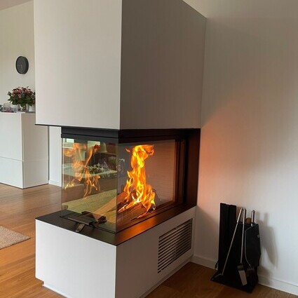 The VISIO 3:1 UNIQ room divider impresses with its first-class features. No frame obscures the view of the flames. The large viewing panel is seamlessly integrated into the design. The fire spreads a cosy atmosphere and cosy warmth on all sides.