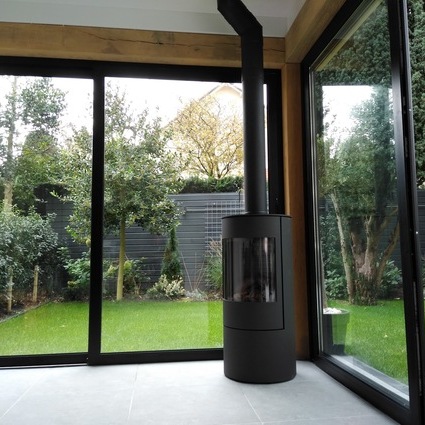 Gas stove VIVA 100 L in platinum with glass door in a minimalist flat with a view of the skyline