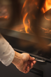 In the three phases of combustion (lighting, firing phase, embers phase), regulating the air supply is crucial for wood consumption. The air regulation is carried out either via the manual control or the fully automatic control. If too much air is supplied to the fire during the firing phase, the wood burns much faster. If the fire receives too little air, this leads to poor combustion. With manual air regulation, it is therefore important to ensure the correct setting. The fully automatic control regulates the air supply automatically.